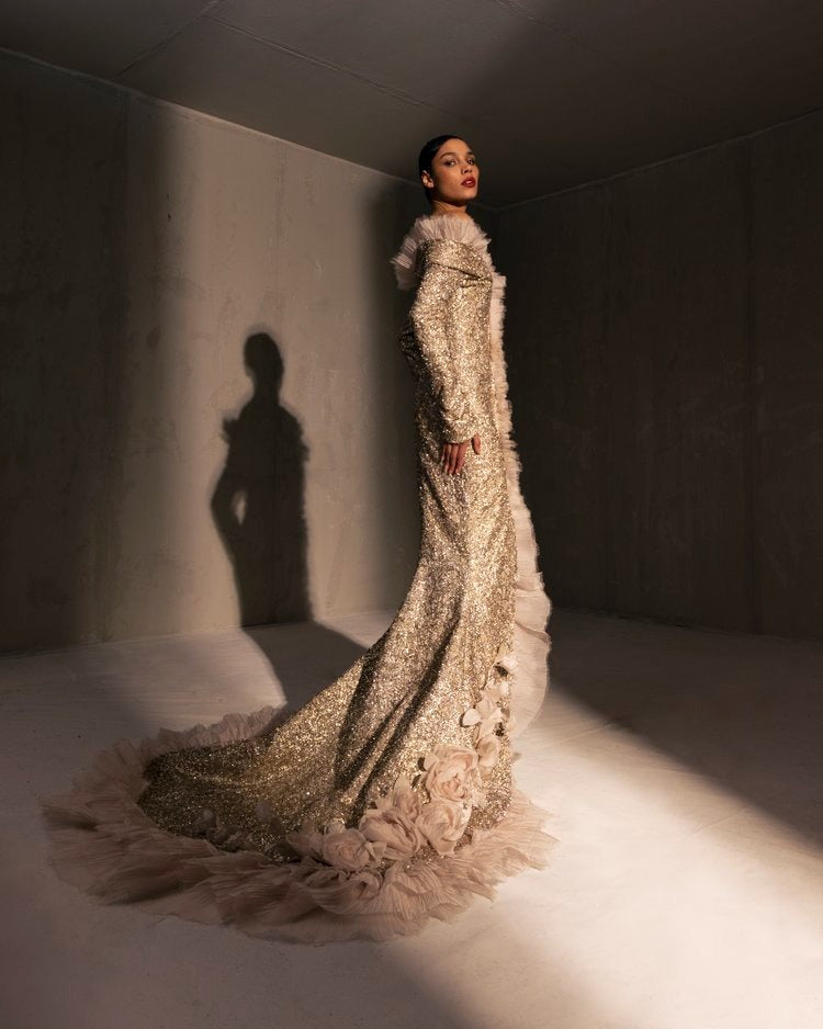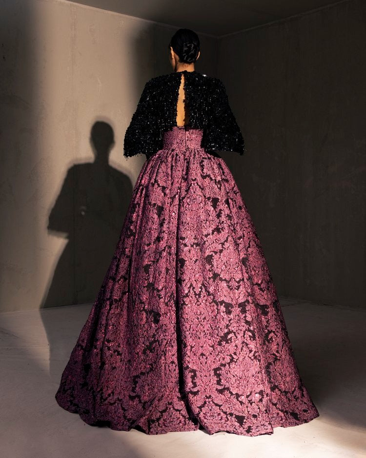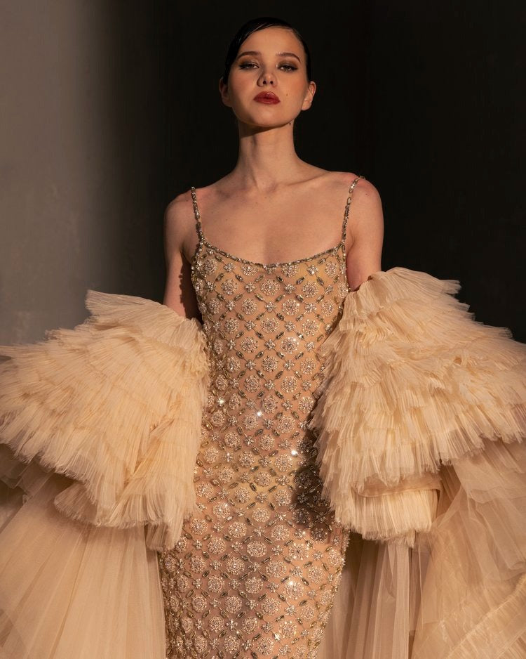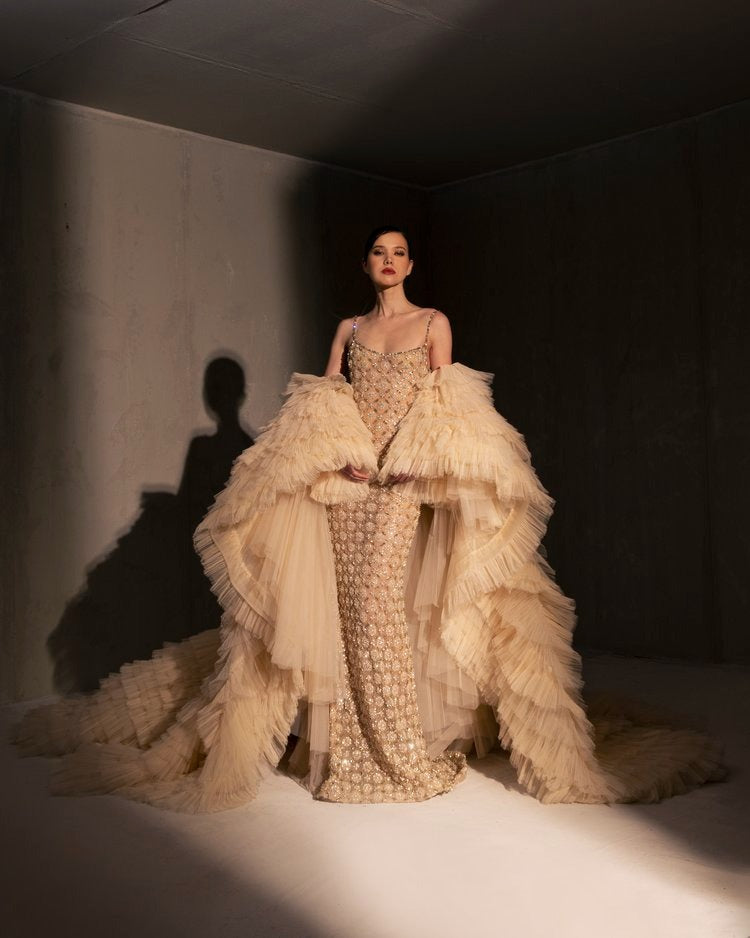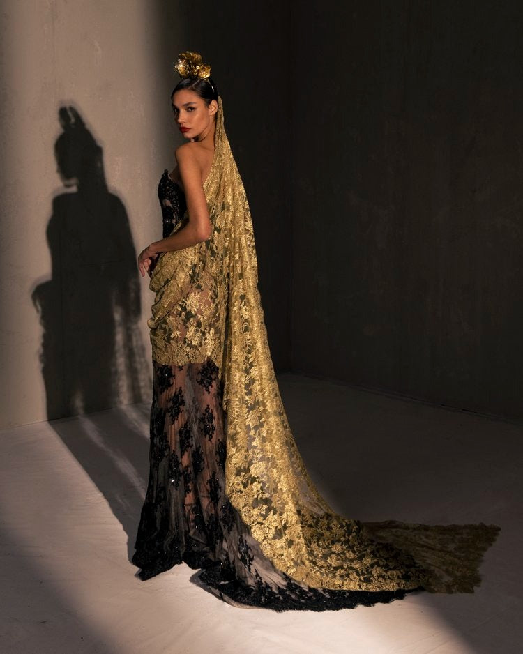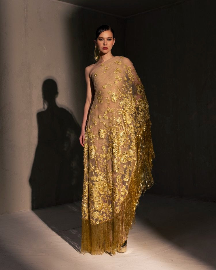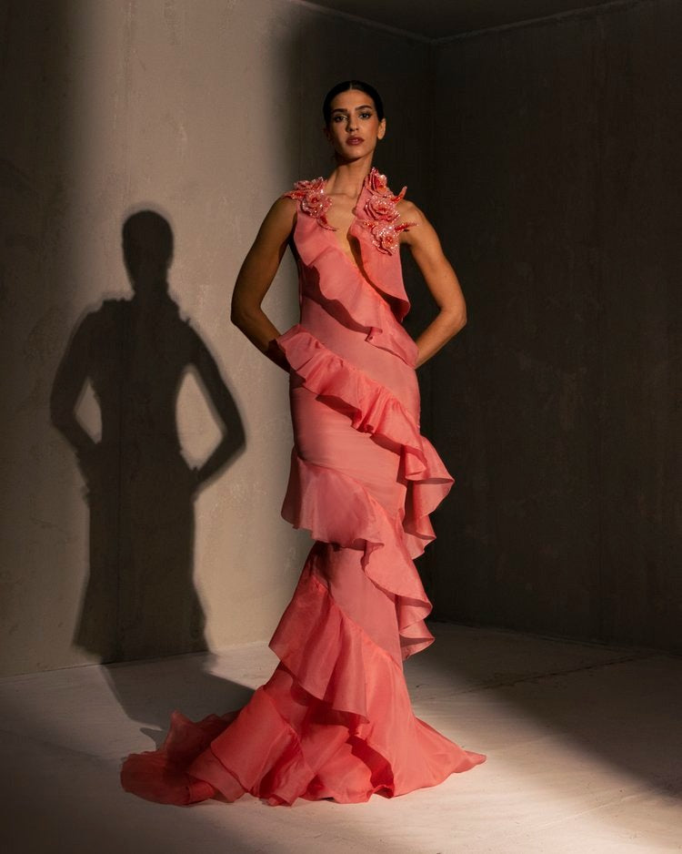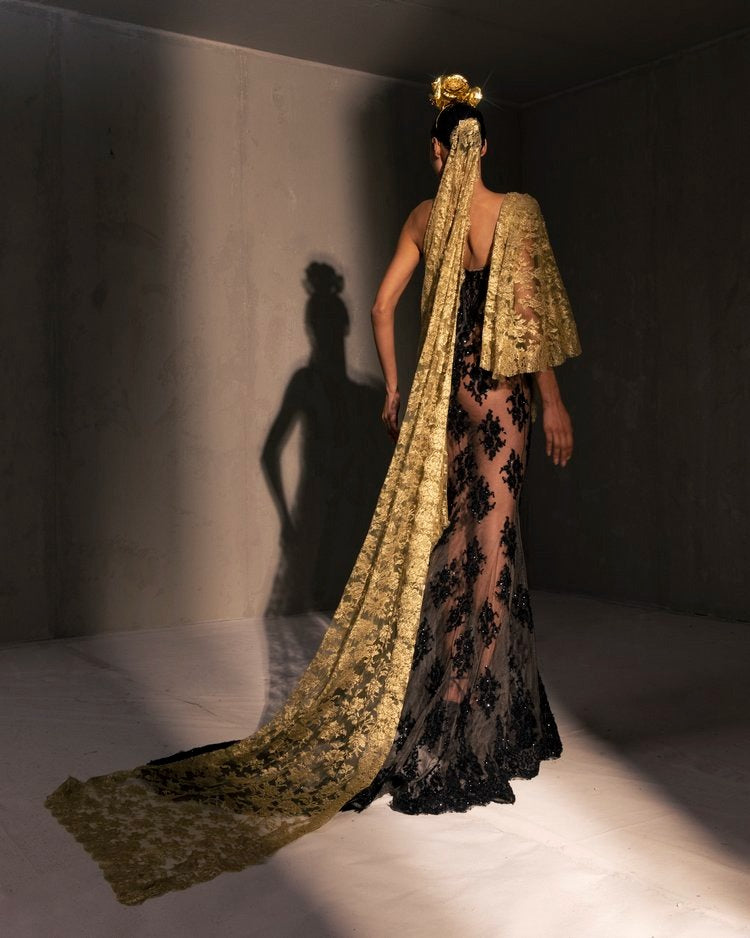 For this year's collection, atelier Elio Abou Fayssal decided to pay homage to spanish heritage. Inspired by flamenco culture, bullfighting, the vibrant spiritual traditions, ceramic murals and sevillian architecture, the designer references the glamour and beauty of Spain in elevated designs and reinterprets techniques with a dash of his unmistakable modernist yet dramatic touch.