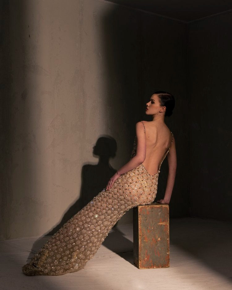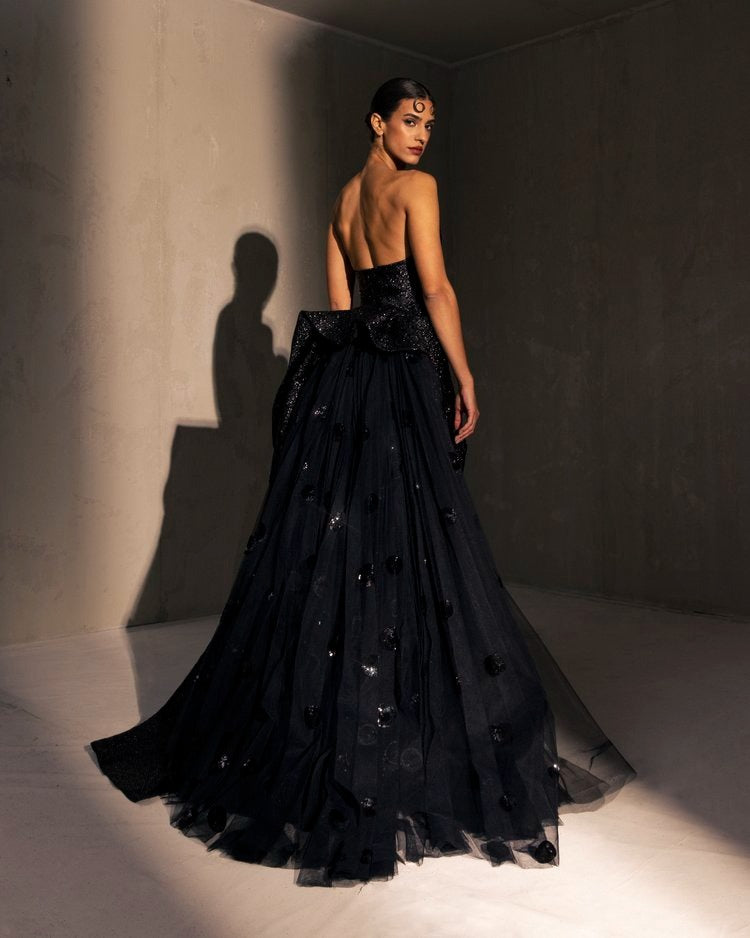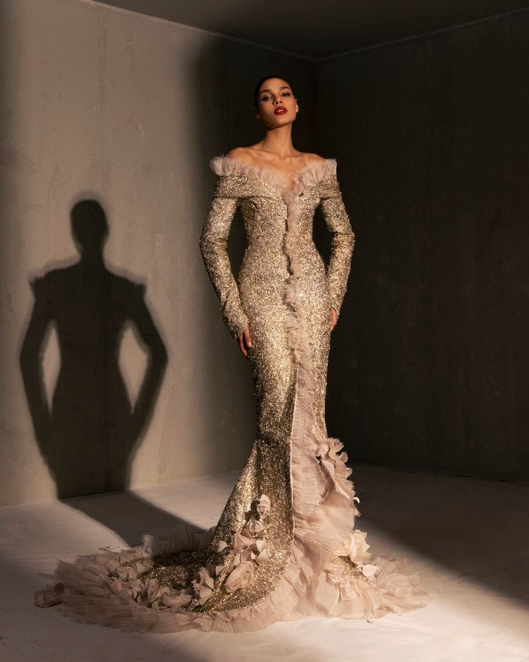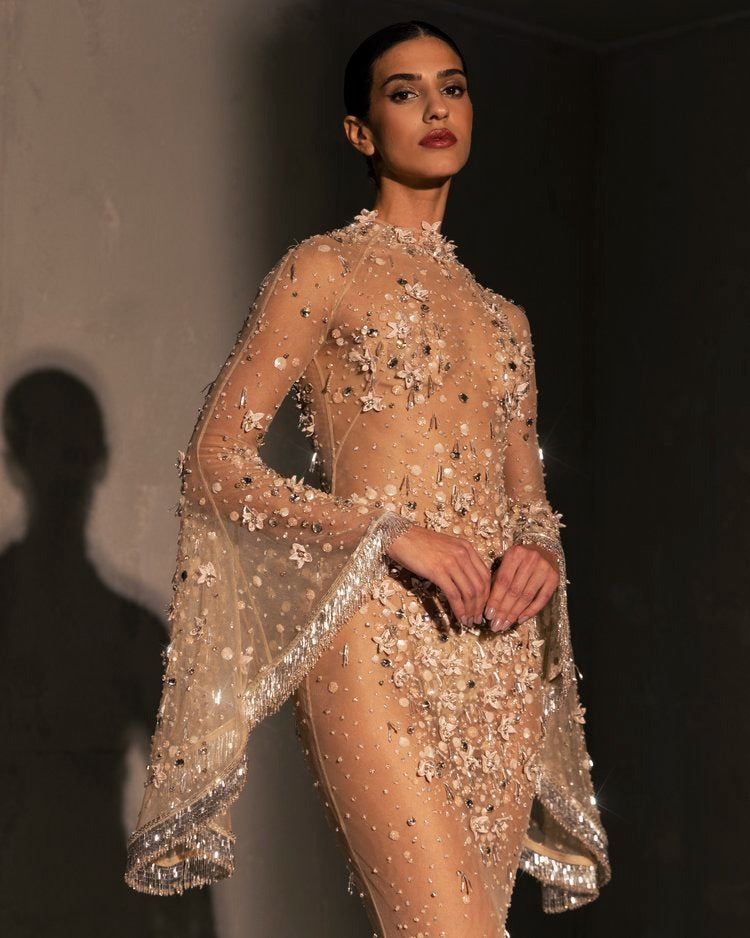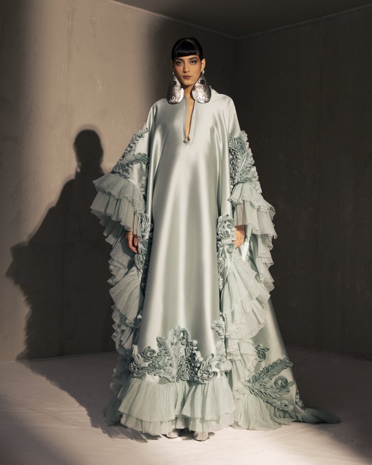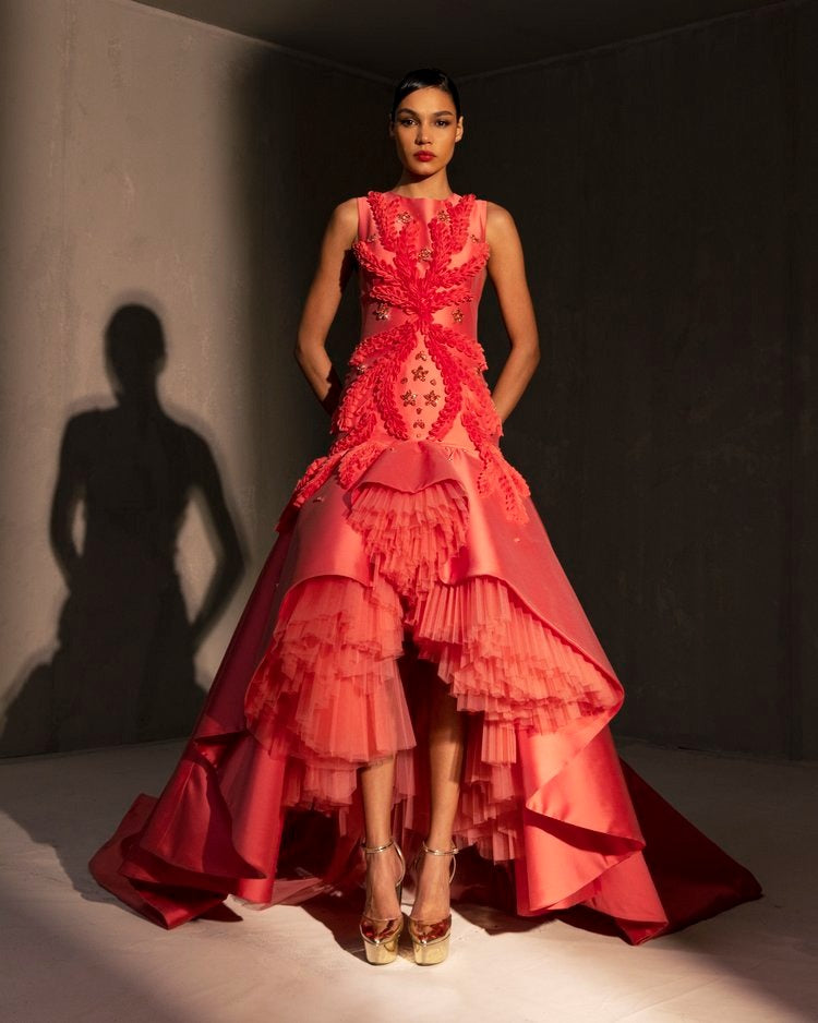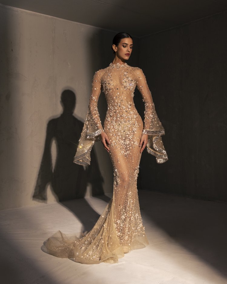 For this year's collection, atelier Elio Abou Fayssal decided to pay homage to spanish heritage. Inspired by flamenco culture, bullfighting, the vibrant spiritual traditions, ceramic murals and sevillian architecture, the designer references the glamour and beauty of Spain in elevated designs and reinterprets techniques with a dash of his unmistakable modernist yet dramatic touch.